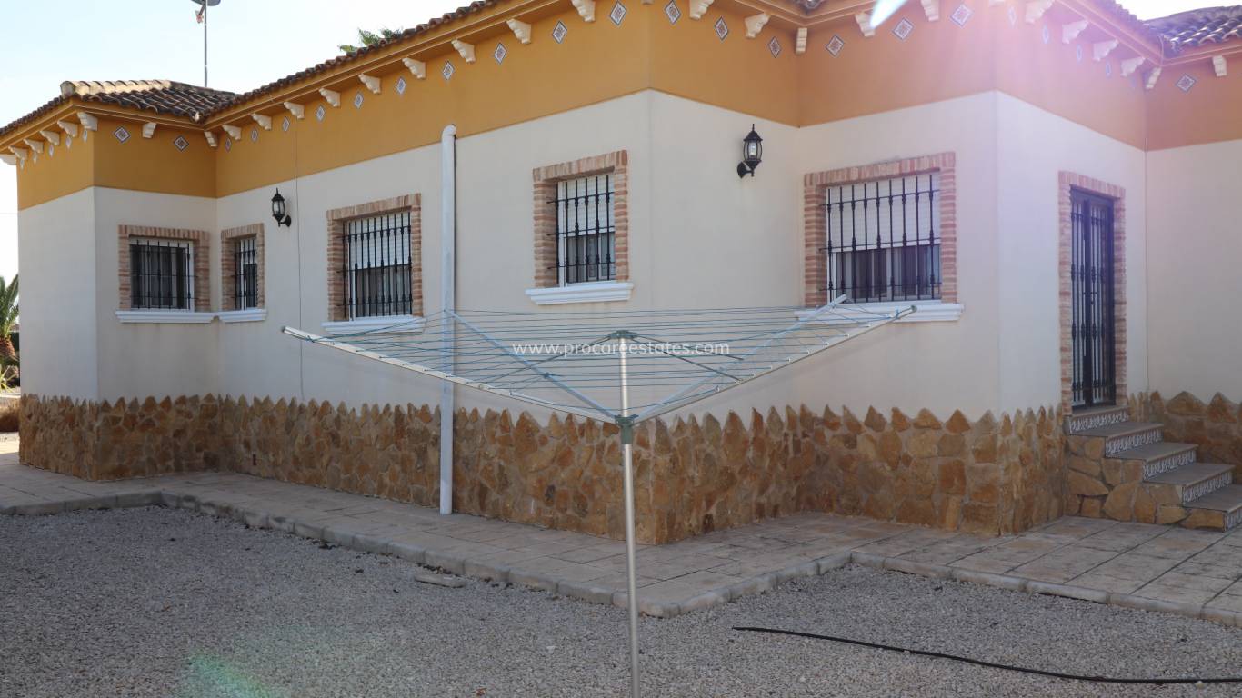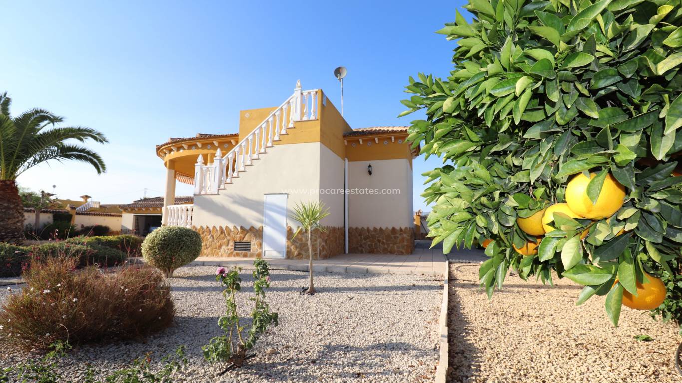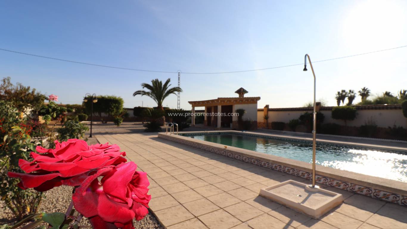 Das Grundstück wurde mit Kies verlegt, wodurch ein wartungsarmes Grundstück entsteht. Innerhalb des Grundstücks gibt es eine große Garage und einen Pool von 10 x 5 m mit Sonnenterrasse. Es gibt eine Sommerküche mit Grill und WC.