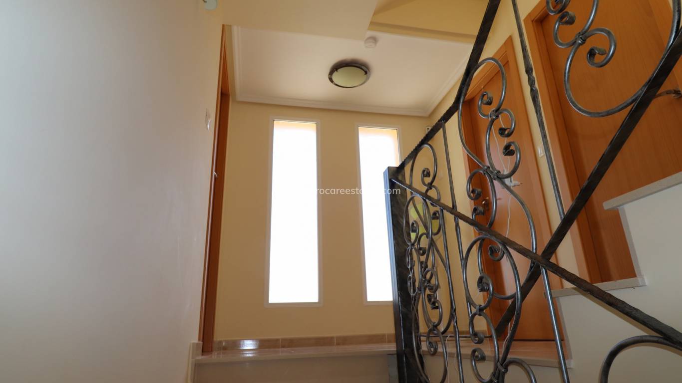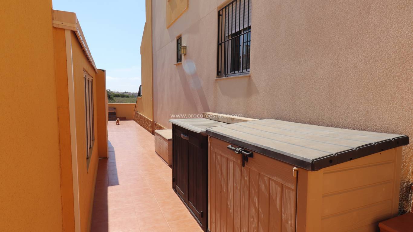 Das Haus befindet sich in einer der neueren Gegenden von Orihuela Costa und dank des größeren Eckgrundstücks ist es auch möglich, einen privaten Pool hinzuzufügen. Die jetzigen Besitzer haben eine Hausbar geschaffen, die ein großartiger Ort für Unterhaltung ist. Unterhalb des Hauses befindet sich die große private Doppelgarage. Der Haupteingang erfolgt über die nach Südosten ausgerichtete Terrasse, Sie gelangen direkt in ein schönes und helles Wohnzimmer, Fernsehzimmer und Esszimmer. Von der Küche hat man Zugang zum Hinterhof. Vom Wohnzimmer gelangt man über eine Treppe in den ersten Stock. Hier haben Sie 2 große Doppelschlafzimmer mit Einbauschränken, eines davon hat einen Balkon mit schöner Aussicht und es gibt ein großes modernes Badezimmer. Von dieser Etage geht es in die zweite Etage, hier befindet sich eine große Dachterrasse mit Blick auf die Umgebung und das Meer in der Ferne. Im Untergeschoss befindet sich eine 67 m2 große Garage, mit Strom und Wasser, hier haben Sie Platz für ein oder mehrere Autos und viel Abstellraum. Es ist ein perfektes Zuhause für ständige Bewohner, aber auch als Feriendomizil. Wenn Sie einen Snack brauchen, sind Sie nur wenige Schritte vom großen, gepflegten Gemeinschaftspool entfernt.