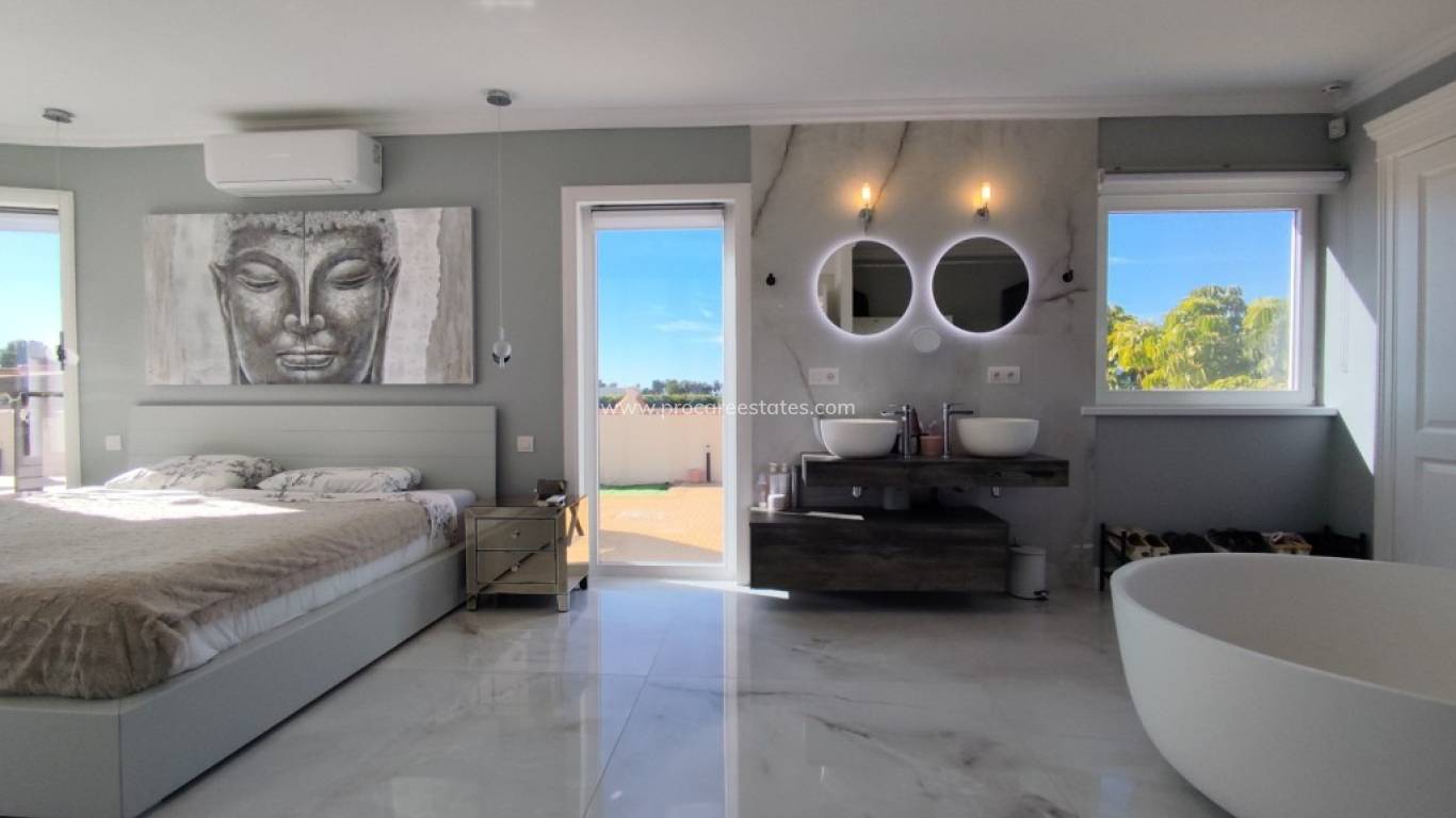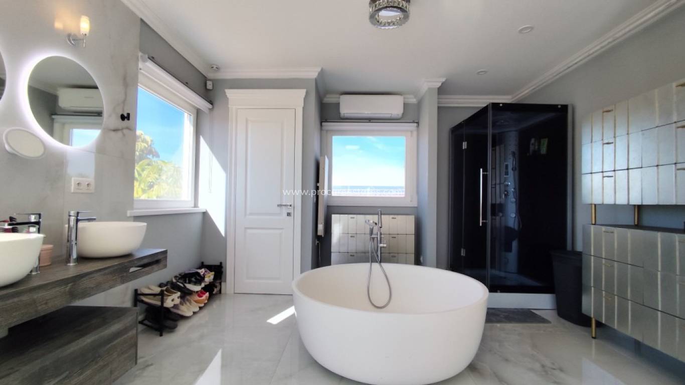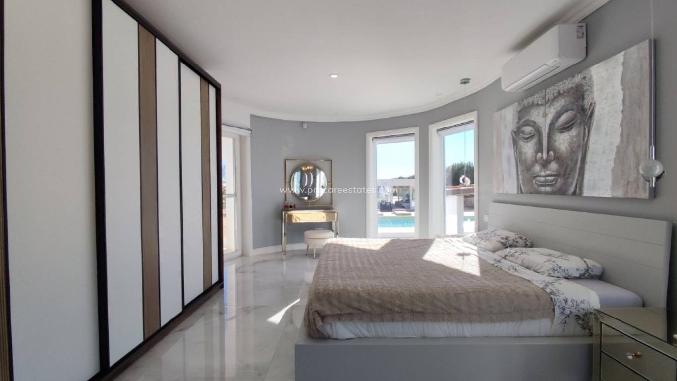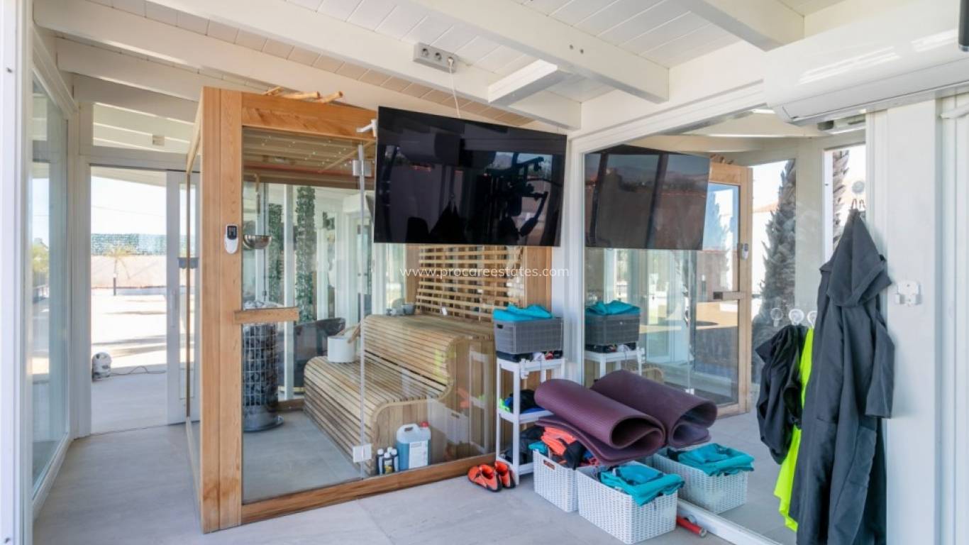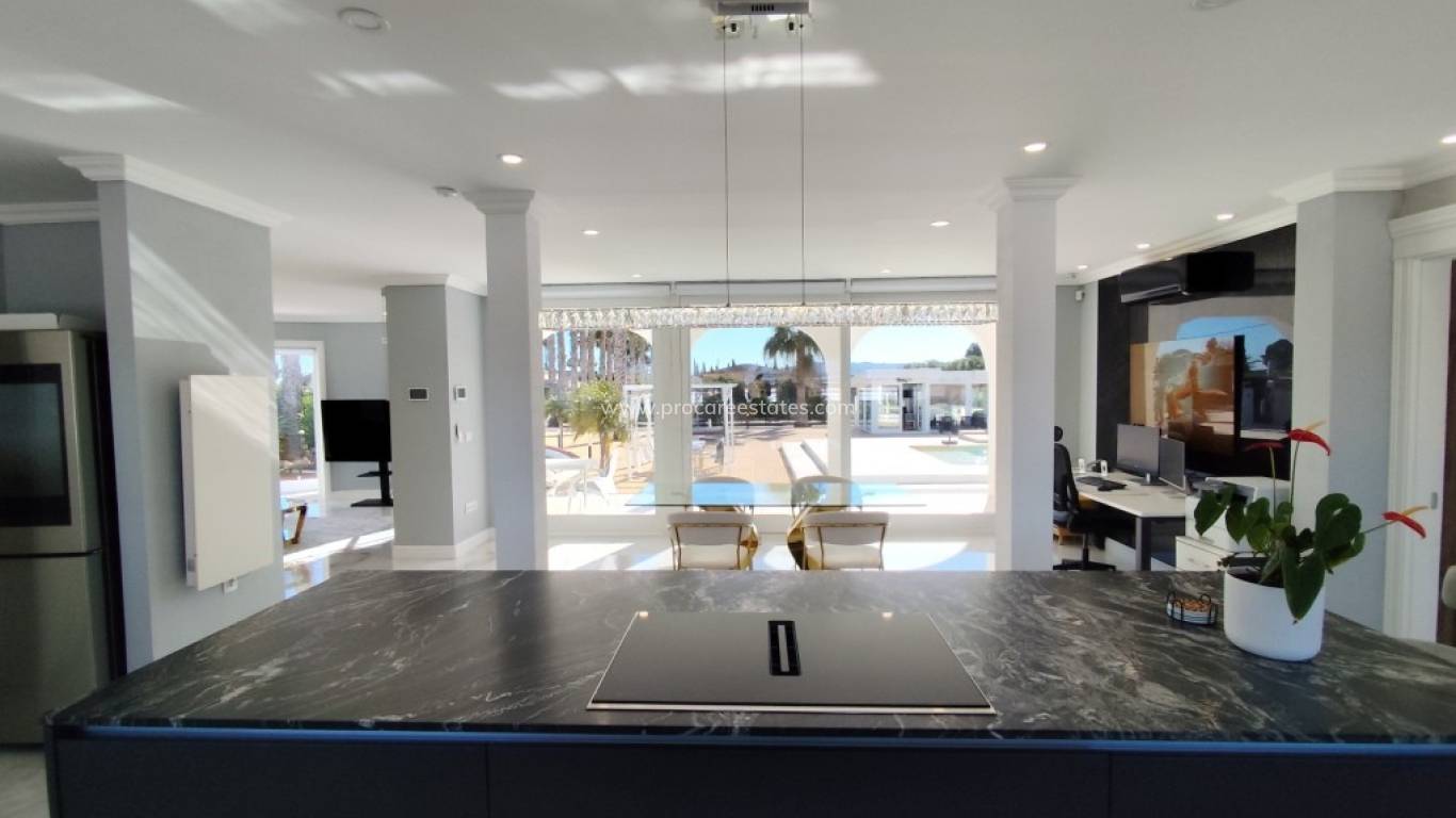 Exclusiva finca mediterránea con instalaciones de bienestar y vistas panorámicas Ubicada en un tranquilo valle de montaña, esta excepcional villa mediterránea combina una arquitectura atemporal, confort contemporáneo y elegancia minimalista. Rodeada de naturaleza y con una ubicación ideal, la última casa de una calle sin salida, la propiedad se encuentra a solo 13 km de la playa, a 40 km del aeropuerto de Alicante, a 2 km del pueblo con todos los servicios y a 7 km de La Finca Golf Resort. Finca privada de 5.600 m² La parcela de 5.600 m² totalmente cerrada, delimitada por altos muros, ofrece total privacidad y alberga la residencia principal junto con varios edificios anexos de alta calidad, todos diseñados para mejorar la comodidad, el ocio y el bienestar. Residencia principal – Vivienda de lujo con orientación sur (165 m²) La villa principal disfruta de una soleada orientación sur y cuenta con: Cocina abierta y comedor con vistas panorámicas al campo, a las montañas y a la piscina. Elegante sala de estar de forma ovalada Habitación doble con baño en suite Dormitorio principal con vestidor, baño integrado y WC separado. Los grandes ventanales garantizan abundante luz natural y una perfecta integración entre el interior y el exterior. Alojamiento para huéspedes y edificios adicionales Casa de huéspedes de madera (50 m²) con dormitorio doble, porche y terraza cubierta que incluye cocina y comedor. Cobertizo de almacenamiento de madera con inodoro Vida al aire libre estilo resort Las zonas exteriores están pensadas para el relax y el entretenimiento: Piscina (50 m² de superficie de agua, 1,5 m de profundidad) Ducha solar y amplia zona chill-out Zona de barbacoa al aire libre con parrilla de acero Comedor exterior totalmente equipado (15 m²) Incluye placa de inducción, horno tradicional, horno de pizza, fregadero, barra y espacio para comer: perfecto para recibir a familiares y amigos. Instalaciones de bienestar Edificio de bienestar acristalado (40 m²) con sauna tradicional, sauna de infrarrojos y zona de relajación con vidrio insonorizado. Edificio Técnico y de Servicios (40 m²) Estacionamiento cubierto para dos autos. Trastero con cámara frigorífica Sala de limpieza Porche y espacio multifuncional acristalado Equipado con 14 paneles solares para eficiencia energética. Seguridad y tecnología La propiedad ofrece características de seguridad avanzadas, que incluyen: Puertas de acceso eléctricas con videoportero. Cámaras de vigilancia Detectores de movimiento interiores y exteriores con control centralizado Doble acristalamiento antirrobo con filtros solares y mosquiteras. Características adicionales Parcialmente amueblado, incluidos electrodomésticos. Agua corriente y electricidad Calefacción eléctrica con radiadores Aire acondicionado (frío y calor) y conexiones de TV/Internet en todos los edificios. Pozo de agua privado Árboles frutales, olivos y palmeras Espectaculares vistas abiertas al campo y a las montañas circundantes. Esta extraordinaria propiedad ofrece privacidad, lujo y bienestar en un entorno natural único, lo que la hace ideal como residencia permanente, refugio de vacaciones o inversión exclusiva. Comuníquese con Sunrisa hoy para obtener más información o para concertar una visita privada a esta extraordinaria propiedad.