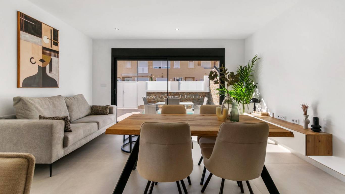New Build Semi-Detached Villas with Private Pool in San Pedro del Pinatar Modern Homes in a Prime Location This exclusive development of 5 semi-detached villas is located in San Pedro del Pinatar, a vibrant coastal town in the Costa Cálida. Positioned near the municipal sports center, within walking distance to the town center, and just 3.5 km from the beaches of the Mar Menor and Mediterranean, these homes offer the perfect blend of comfort, convenience, and Mediterranean lifestyle. Contemporary Design and Functional Layout Each villa is distributed across two floors and designed with modern architecture, maximizing space and natural light. With 3 bedrooms and 2 bathrooms, these properties are ideal for families, holiday homes, or investment. Ground Floor: Open-plan kitchen connected to the bright living and dining area, one bedroom, one bathroom, a rear patio and direct access to the private garden with pool. First Floor: Two additional bedrooms, one bathroom, and a spacious terrace with access to the private rooftop solarium, perfect for sunbathing or entertaining. Quality Finishes and Comfort The villas are delivered with high-quality specifications and thoughtful details to ensure modern living: Fully furnished and equipped kitchen with appliances Private swimming pool and garden Rooftop solarium for year-round outdoor living Summer kitchen included Interior and exterior lighting package Closed private garage San Pedro del Pinatar - Lifestyle and Surroundings San Pedro del Pinatar is renowned for its year-round sunshine, sandy beaches, and natural landscapes such as the famous Salinas y Arenales Natural Park. The town offers all essential services, including shops, supermarkets, restaurants, health centers, and sports facilities, making it an excellent place for both permanent living and holidays. Distances to key points of interest: Beaches of the Mar Menor - 3.5 km Dos Mares Shopping Center - 5 km Lo Pagán Marina - 4 km Roda Golf - 8 km Murcia Airport (Corvera) - 35 km Alicante Airport – 75 km Secure Your New Home by the Sea These new build semi-detached villas in San Pedro del Pinatar combine modern design, high-quality finishes, and a privileged location close to the sea and all amenities. Contact us today for more information or to schedule a viewing and take the first step toward your dream Mediterranean home.