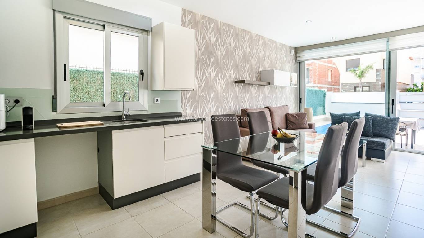 Discover this beautiful villa located in charming Lo Pagán , in San Pedro del Pinatar  just 500 meters from the sea . This well-maintained property combines comfort, space, and an excellent location on the Costa Cálida, ideal as a holiday home, investment, or permanent residence. The villa, built in 2015 , stands on a plot of 162 m² and features a built area of 109 m² , distributed over two floors . Inside, you will find three spacious bedrooms and two bathrooms , making the home perfectly suitable for families or entertaining guests. Outdoor living takes center stage here thanks to the three terraces , two of which are on the upper floor , ideal for enjoying the sun and the Mediterranean climate. The south-facing terrace is equipped with new garden furniture and a new awning (2025) , allowing you to relax comfortably outdoors all year round. Additionally, the property features a private swimming pool , perfect for cooling off during hot summer days. The fully equipped kitchen features all necessary appliances, including a microwave, ceramic hob with oven, refrigerator, and freezer . Furthermore, there is a separate storage room with a washing machine for extra practical convenience. For a pleasant indoor climate, the villa is equipped with newly installed ducted hot/cold air conditioning (2025) in all rooms, which can also be controlled remotely via an app . Naturally, internet access is also available. With its excellent location close to the sea, modern amenities, and pleasant outdoor spaces, this villa is an ideal place to enjoy the Mediterranean life. Energy label: D Interested in this beautiful seaside villa? Contact us today for more information or schedule a viewing. We would be happy to help you discover this home for yourself!